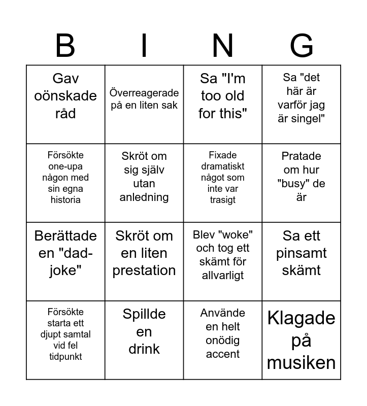This bingo card has 16 words: Spillde en drink, Sa ett pinsamt skämt, Sa "I'm too old for this", Gav oönskade råd, Berättade en "dad-joke", Överreagerade på en liten sak, Blev "woke" och tog ett skämt för allvarligt, Använde en helt onödig accent, Försökte one-upa någon med sin egna historia, Skröt om sig själv utan anledning, Försökte starta ett djupt samtal vid fel tidpunkt, Sa "det här är varför jag är singel", Skröt om en liten prestation, Pratade om hur "busy" de är, Fixade dramatiskt något som inte var trasigt and Klagade på musiken.