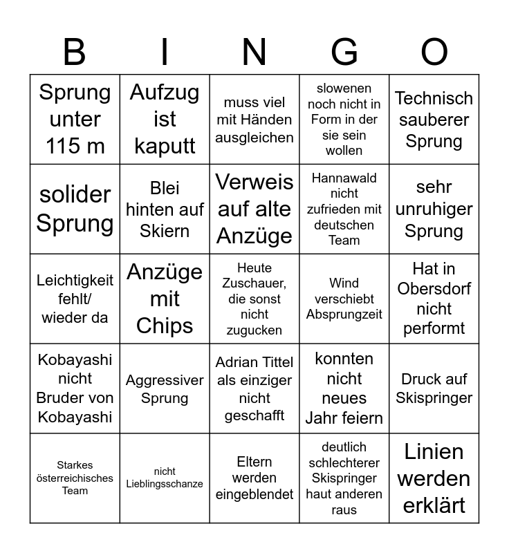 This bingo card has 25 words: Aggressiver Sprung, Eltern werden eingeblendet, Verweis auf alte Anzüge, Starkes österreichisches Team, Technisch sauberer Sprung, Sprung unter 115 m, solider Sprung, Aufzug ist kaputt, Wind verschiebt Absprungzeit, Adrian Tittel als einziger nicht geschafft, Hannawald nicht zufrieden mit deutschen Team, Leichtigkeit fehlt/ wieder da, konnten nicht neues Jahr feiern, Druck auf Skispringer, Blei hinten auf Skiern, Linien werden erklärt, Hat in Obersdorf nicht performt, muss viel mit Händen ausgleichen, sehr unruhiger Sprung, Anzüge mit Chips, Heute Zuschauer, die sonst nicht zugucken, nicht Lieblingsschanze, Kobayashi nicht Bruder von Kobayashi, slowenen noch nicht in Form in der sie sein wollen and deutlich schlechterer Skispringer haut anderen raus.