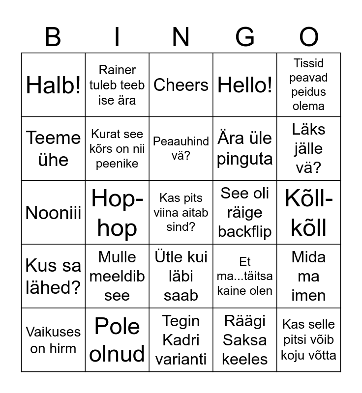 This bingo card has 34 words: Kas selle pitsi võib koju võtta, Räägi Saksa keeles, Head lõppu, Sulle ja mulle jah?, Kus sa lähed?, Kurat see kõrs on nii peenike, Tissid peavad peidus olema, Vaikuses on hirm, Rainer tuleb teeb ise ära, Sa oleks nagu ennegi seda teinud, Peaauhind vä?, Cheers, Kuradi trumlid on ovaalsed, Kerdo tule ära, See oli räige backflip, Läks jälle vä?, Pole olnud, Nooniii, Mulle meeldib see, Et ma...täitsa kaine olen, Ütle kui läbi saab, Spläshhhh, Halb!, Kõll-kõll, Tegin Kadri varianti, Kas pits viina aitab sind?, Hello!, Läheb,läheb, Ära üle pinguta, Teeme ühe, Uuuuuuu, Hop-hop, Mida ma imen and Sirle!.