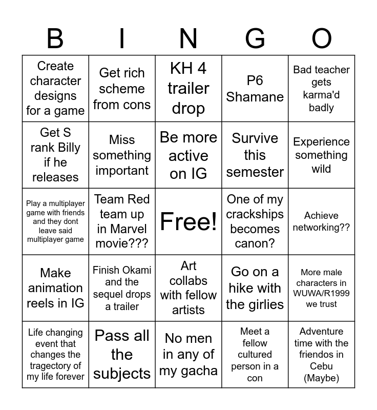 This bingo card has a free space and 24 words: Finish Okami and the sequel drops a trailer, Pass all the subjects, Be more active on IG, Life changing event that changes the tragectory of my life forever, Bad teacher gets karma'd badly, Create character designs for a game, Get S rank Billy if he releases, Get rich scheme from cons, One of my crackships becomes canon?, Art collabs with fellow artists, Survive this semester, Play a multiplayer game with friends and they dont leave said multiplayer game, Go on a hike with the girlies, More male characters in WUWA/R1999 we trust, Miss something important, Meet a fellow cultured person in a con, Achieve networking??, KH 4 trailer drop, Experience something wild, Team Red team up in Marvel movie???, Adventure time with the friendos in Cebu (Maybe), Make animation reels in IG, P6 Shamane and No men in any of my gacha.
