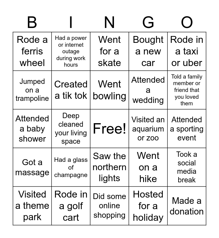 This bingo card has a free space and 24 words: Had a glass of champagne, Rode in a golf cart, Went bowling, Visited a theme park, Rode in a taxi or uber, Rode a ferris wheel, Jumped on a trampoline, Had a power or internet outage during work hours, Visited an aquarium or zoo, Saw the northern lights, Attended a wedding, Attended a baby shower, Went on a hike, Took a social media break, Created a tik tok, Hosted for a holiday, Attended a sporting event, Went for a skate, Told a family member or friend that you loved them, Deep cleaned your living space, Made a donation, Got a massage, Bought a new car and Did some online shopping.
