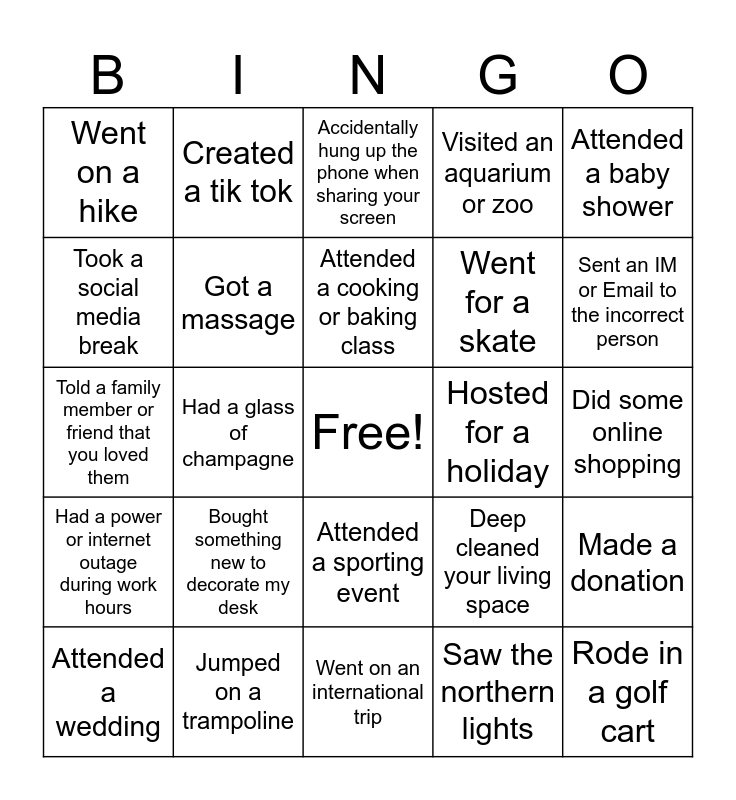 This bingo card has a free space and 25 words: Bought something new to decorate my desk, Went on an international trip, Attended a cooking or baking class, Attended a wedding, Attended a baby shower, Went on a hike, Took a social media break, Created a tik tok, Hosted for a holiday, Attended a sporting event, Went for a skate, Told a family member or friend that you loved them, Deep cleaned your living space, Made a donation, Got a massage, Bought a new car, Did some online shopping, Accidentally hung up the phone when sharing your screen, Sent an IM or Email to the incorrect person, Had a glass of champagne, Rode in a golf cart, Jumped on a trampoline, Had a power or internet outage during work hours, Visited an aquarium or zoo and Saw the northern lights.