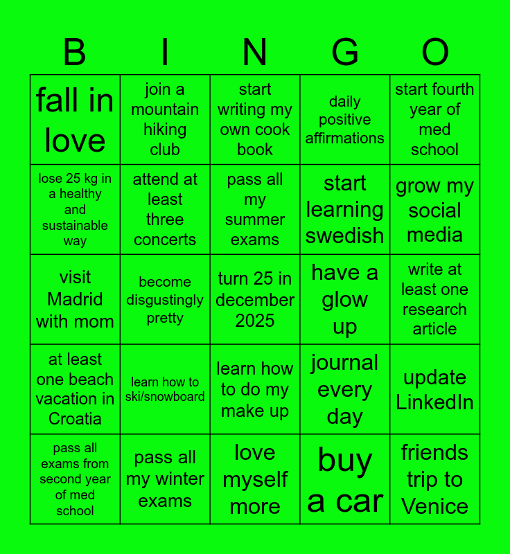 This bingo card has a free space and 24 words: learn how to ski/snowboard, pass all my winter exams, pass all my summer exams, pass all exams from second year of med school, start fourth year of med school, fall in love, lose 25 kg in a healthy and sustainable way, join a mountain hiking club, have a glow up, learn how to do my make up, start learning swedish, visit Madrid with mom, journal every day, update LinkedIn, attend at least three concerts, buy a car, write at least one research article, start writing my own cook book, grow my social media, become disgustingly pretty, friends trip to Venice, at least one beach vacation in Croatia, daily positive affirmations and love myself more.