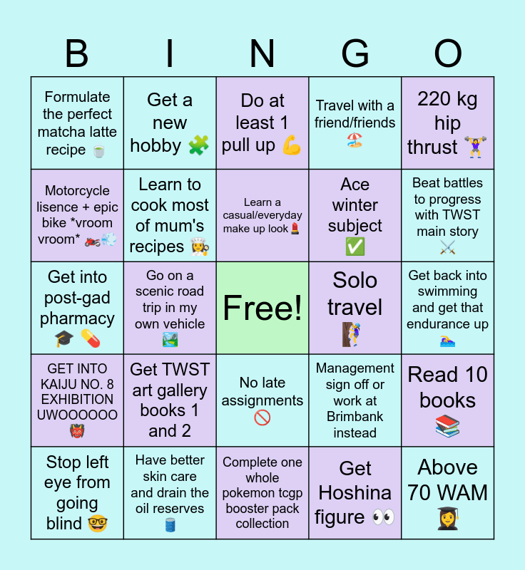 This bingo card has a free space and 24 words: Get TWST art gallery books 1 and 2, Have better skin care and drain the oil reserves 🛢, Learn a casual/everyday make up look💄, Stop left eye from going blind 🤓, 220 kg hip thrust 🏋♀️, Formulate the perfect matcha latte recipe 🍵, Motorcycle lisence + epic bike *vroom vroom* 🏍💨, Get a new hobby 🧩, Solo travel 🧗♀️, No late assignments 🚫, Ace winter subject ✅️, Get into post-gad pharmacy 🎓 💊, Management sign off or work at Brimbank instead, Read 10 books 📚, Learn to cook most of mum's recipes 👩🍳, Get Hoshina figure 👀, Get back into swimming and get that endurance up 🏊♀️, Do at least 1 pull up 💪, Beat battles to progress with TWST main story ⚔️, Go on a scenic road trip in my own vehicle 🏞, Above 70 WAM 👩🎓, GET INTO KAIJU NO. 8 EXHIBITION UWOOOOOO 👹, Travel with a friend/friends 🏖 and Complete one whole pokemon tcgp booster pack collection.