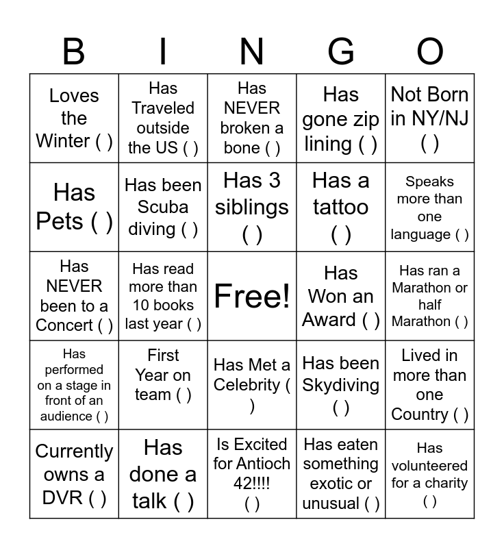This bingo card has a free space and 24 words: First Year on team ( ), Has done a talk ( ), Has 3 siblings ( ), Currently owns a DVR ( ), Not Born in NY/NJ ( ), Loves the Winter ( ), Has Pets ( ), Has Traveled outside the US ( ), Has Won an Award ( ), Has Met a Celebrity ( ), Has a tattoo ( ), Has NEVER been to a Concert ( ), Has been Skydiving ( ), Lived in more than one Country ( ), Has been Scuba diving ( ), Has eaten something exotic or unusual ( ), Has ran a Marathon or half Marathon ( ), Has NEVER broken a bone ( ), Speaks more than one language ( ), Has read more than 10 books last year ( ), Has volunteered for a charity ( ), Has performed on a stage in front of an audience ( ), Has gone zip lining ( ) and Is Excited for Antioch 42!!!! ( ).