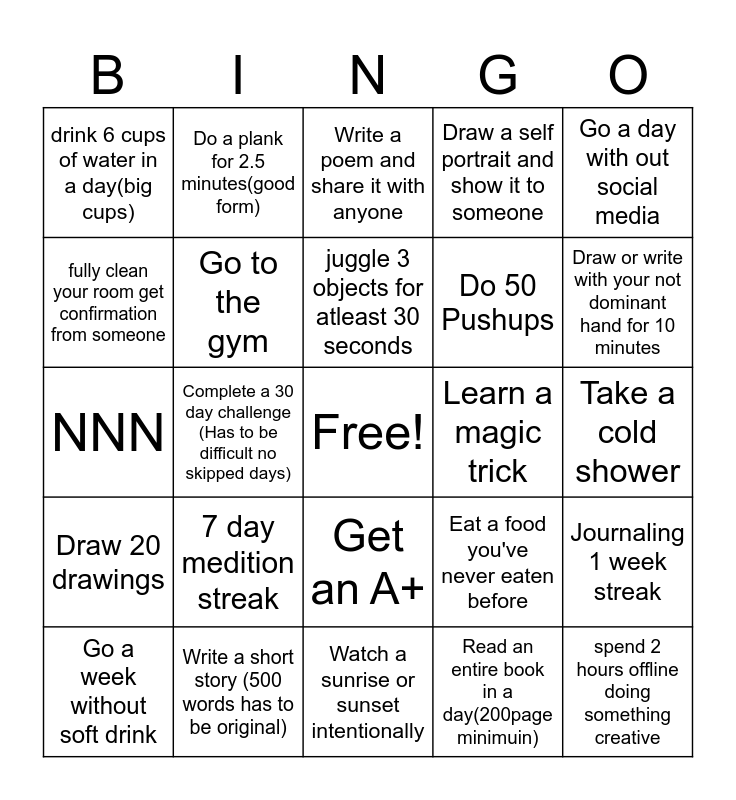 This bingo card has a free space and 24 words: 7 day medition streak, Write a short story (500 words has to be original), juggle 3 objects for atleast 30 seconds, Go a week without soft drink, Go a day with out social media, drink 6 cups of water in a day(big cups), fully clean your room get confirmation from someone, Do a plank for 2.5 minutes(good form), Learn a magic trick, Get an A+, Do 50 Pushups, NNN, Eat a food you've never eaten before, Journaling 1 week streak, Go to the gym, Read an entire book in a day(200page minimuin), Take a cold shower, Write a poem and share it with anyone, Draw or write with your not dominant hand for 10 minutes, Complete a 30 day challenge (Has to be difficult no skipped days), spend 2 hours offline doing something creative, Draw 20 drawings, Draw a self portrait and show it to someone and Watch a sunrise or sunset intentionally.
