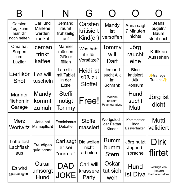 This bingo card has a free space and 49 words: Jörg nutzt Jugend-sprache, Jörg raucht eine, Oskar tut sich weh, Mandy kommt zu nah, Lea sitzt mit Tablet in der Ecke, Jörg ist dicht, Carl und Marlene werden radikal, DAD JOKE, Anna sagt 7 Minuten nichts, Stoffel massiert, Jeans bügeln/ Baum steht noch, Carsten kritisiert Kind(er), Bine kritisiert Alk Konsum, Jemand sucht Alk im Schrank, Freudiges quietschen, Hund sucht Mutti, Oma hat Sorgen um Luzifer, Kritik an Aussehen, Dirk flirtet, Mandy ist versoffen, Tommy will Dart, Steffi nötigt Tommy, Carsten fragt kann man dir noch helfen, Iceman trinkt kaffee, Es wird gesungen, Männer müssen Gläser füllen, ✨transgen. Trauma✨, Oskar umsorgt Hund, Heidi ist süß zu Stoffel, Lea will kuscheln, Lotta spielt Instrument, Marlene betreibt Psychoanalyse, Lotta löst Lachflash aus, Carl sagt er sei "normal", Männer fliehen in Garage, Wortgefecht der Pettan Kinder, Kommentar über Essverhalten, Mutti validiert, Eierlikör Shot, Feminismus Debatte, Die wollen nicht arbeiten, Merz Wortwitz, Vorzüge von (hetero) Partnerschaften, Carl will krassere Party, Was habt ihr für Vorsätze?, Jemand räumt frühzeitig auf, Bumm bumm Stern, Jette hat Mamapflicht and Hund ist Diva.