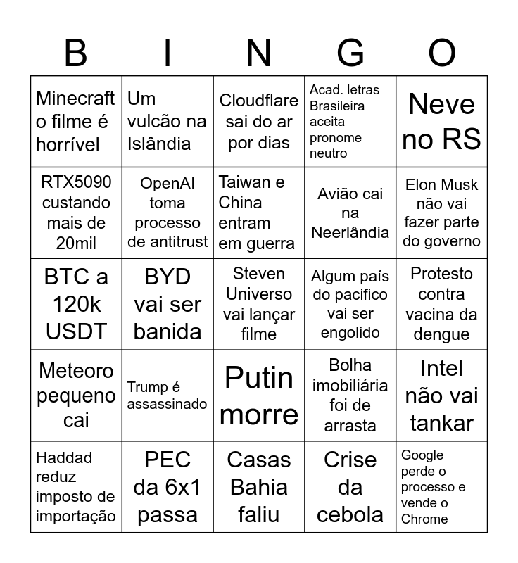 This bingo card has 25 words: Trump é assassinado, Casas Bahia faliu, Taiwan e China entram em guerra, Haddad reduz imposto de importação, Neve no RS, Minecraft o filme é horrível, RTX5090 custando mais de 20mil, Um vulcão na Islândia, Algum país do pacifico vai ser engolido, Putin morre, Avião cai na Neerlândia, BTC a 120k USDT, Bolha imobiliária foi de arrasta, Intel não vai tankar, OpenAI toma processo de antitrust, Google perde o processo e vende o Chrome, Protesto contra vacina da dengue, Cloudflare sai do ar por dias, Elon Musk não vai fazer parte do governo, BYD vai ser banida, Steven Universo vai lançar filme, PEC da 6x1 passa, Meteoro pequeno cai, Acad. letras Brasileira aceita pronome neutro and Crise da cebola.