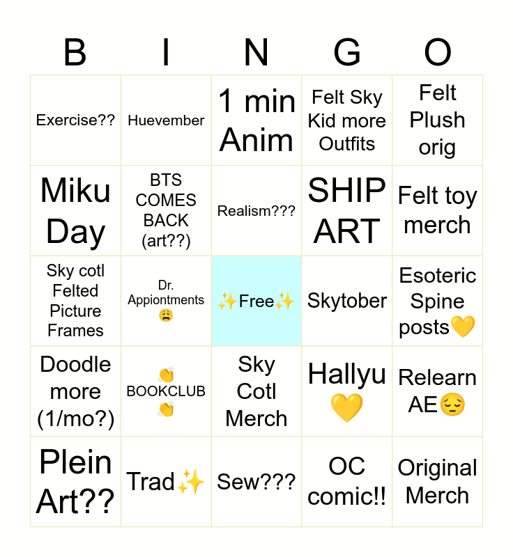 This bingo card has a free space and 24 words: 👏BOOKCLUB👏, Trad✨, Realism???, Plein Art??, Felt Plush orig, Exercise??, Miku Day, Huevember, Skytober, Sky Cotl Merch, SHIP ART, Sky cotl Felted Picture Frames, Hallyu💛, Relearn AE😔, BTS COMES BACK (art??), OC comic!!, Esoteric Spine posts💛, 1 min Anim, Felt toy merch, Dr. Appiontments 😩, Original Merch, Doodle more (1/mo?), Felt Sky Kid more Outfits and Sew???.