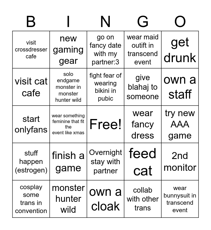 This bingo card has a free space and 24 words: finish a game, monster hunter wild, fight fear of wearing bikini in pubic, cosplay some trans in convention, get drunk, visit crossdresser cafe, visit cat cafe, new gaming gear, wear fancy dress, Overnight stay with partner, give blahaj to someone, start onlyfans, feed cat, 2nd monitor, solo endgame monster in monster hunter wild, collab with other trans, try new AAA game, go on fancy date with my partner:3, own a staff, wear something feminine that fit the event like xmas, wear bunnysuit in transcend event, stuff happen (estrogen), wear maid outift in transcend event and own a cloak.