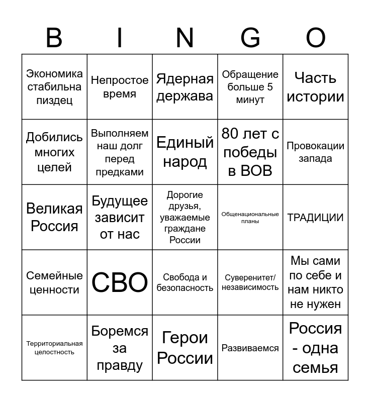 This bingo card has a free space and 24 words: СВО, Боремся за правду, Единый народ, Территориальная целостность, Часть истории, Экономика стабильна пиздец, Добились многих целей, Непростое время, Общенациональные планы, Свобода и безопасность, 80 лет с победы в ВОВ, Великая Россия, Суверенитет/независимость, Мы сами по себе и нам никто не нужен, Выполняем наш долг перед предками, Развиваемся, ТРАДИЦИИ, Ядерная держава, Провокации запада, Будущее зависит от нас, Россия - одна семья, Семейные ценности, Обращение больше 5 минут and Герои России.