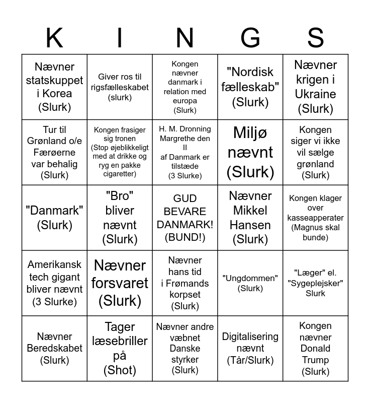This bingo card has a free space and 24 words: Nævner forsvaret (Slurk), Tager læsebriller på (Shot), H. M. Dronning Margrethe den II af Danmark er tilstæde (3 Slurke), Nævner Beredskabet (Slurk), Nævner krigen i Ukraine (Slurk), Nævner statskuppet i Korea (Slurk), Tur til Grønland o/e Færøerne var behalig (Slurk), Giver ros til rigsfælleskabet (slurk), Nævner Mikkel Hansen (Slurk), Nævner hans tid i Frømands korpset (Slurk), Miljø nævnt (Slurk), "Danmark" (Slurk), "Ungdommen" (Slurk), "Læger" el. "Sygeplejsker" Slurk, Kongen frasiger sig tronen (Stop øjeblikkeligt med at drikke og ryg en pakke cigaretter), Digitalisering nævnt (Tår/Slurk), Kongen klager over kasseapperater (Magnus skal bunde), Kongen nævner danmark i relation med europa (Slurk), Kongen siger vi ikke vil sælge grønland (Slurk), "Bro" bliver nævnt (Slurk), Kongen nævner Donald Trump (Slurk), Amerikansk tech gigant bliver nævnt (3 Slurke), "Nordisk fælleskab" (Slurk) and Nævner andre væbnet Danske styrker (Slurk).