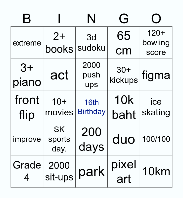 This bingo card has a free space and 24 words: SK sports day., 2000 sit-ups, 2000 push ups, Grade 4, 120+ bowling score, extreme, 3+ piano, 2+ books, 10k baht, 200 days, 30+ kickups, front flip, duo, 100/100, act, pixel art, ice skating, 3d sudoku, figma, 10+ movies, 10km, improve, 65 cm and park.