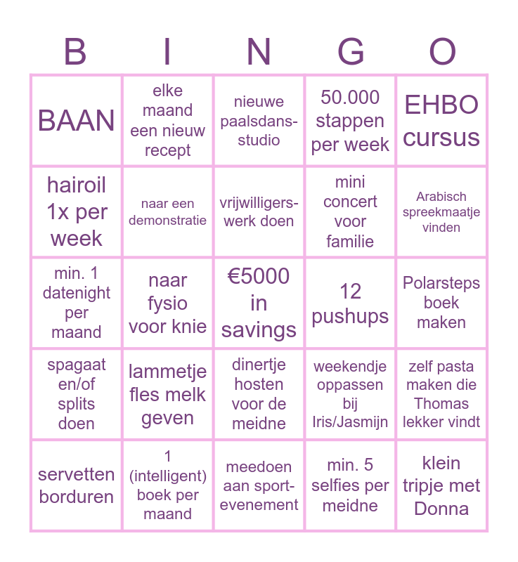 This bingo card has a free space and 24 words: lammetje fles melk geven, 1 (intelligent) boek per maand, vrijwilligers-werk doen, servetten borduren, EHBO cursus, BAAN, hairoil 1x per week, elke maand een nieuw recept, 12 pushups, dinertje hosten voor de meidne, mini concert voor familie, min. 1 datenight per maand, weekendje oppassen bij Iris/Jasmijn, zelf pasta maken die Thomas lekker vindt, naar een demonstratie, min. 5 selfies per meidne, Polarsteps boek maken, nieuwe paalsdans-studio, Arabisch spreekmaatje vinden, naar fysio voor knie, klein tripje met Donna, spagaat en/of splits doen, 50.000 stappen per week and meedoen aan sport-evenement.