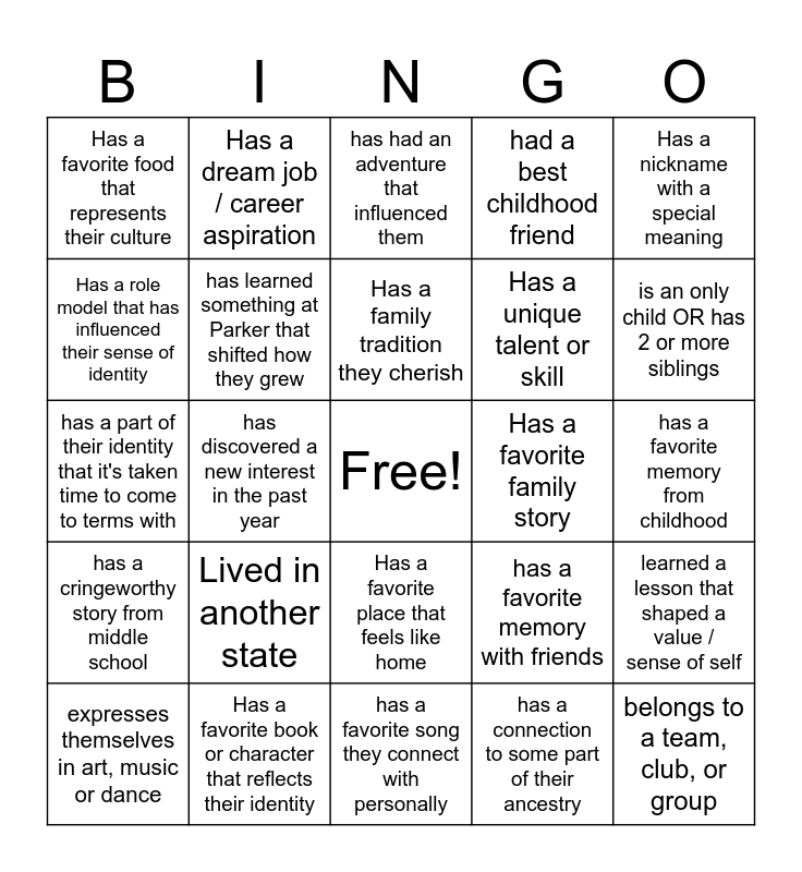 This bingo card has a free space and 24 words: Lived in another state, Has a favorite book or character that reflects their identity, Has a family tradition they cherish, expresses themselves in art, music or dance, Has a nickname with a special meaning, Has a favorite food that represents their culture, Has a role model that has influenced their sense of identity, Has a dream job / career aspiration, Has a favorite family story, Has a favorite place that feels like home, Has a unique talent or skill, has a part of their identity that it's taken time to come to terms with, has a favorite memory with friends, learned a lesson that shaped a value / sense of self, has learned something at Parker that shifted how they grew, has a connection to some part of their ancestry, has a favorite memory from childhood, has had an adventure that influenced them, is an only child OR has 2 or more siblings, has discovered a new interest in the past year, belongs to a team, club, or group, has a cringeworthy story from middle school, had a best childhood friend and has a favorite song they connect with personally.