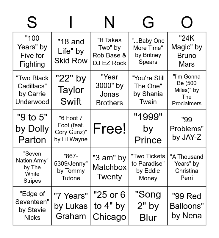 This bingo card has a free space and 34 words: "One" by Metallica, "Song 2" by Blur, "FourFiveSeconds" by Rihanna, Kanye West, "Like a G6" by Far East Movement, The Cataracs & Dev, "Seven Nation Army" by The White Stripes, "22" by Taylor Swift, "24K Magic" by Bruno Mars, "Edge of Seventeen" by Stevie Nicks, "18 and Life" by Skid Row, "Mambo No. 5 (a Little Bit of...)" by Lou Bega, "Year 3000" by Jonas Brothers, "It Takes Two" by Rob Base & DJ EZ Rock, "December, 1963 (Oh, What a Night!)" by The Four Seasons, "1985" by Bowling for Soup, "1999" by Prince, "I'm Gonna Be (500 Miles)" by The Proclaimers, "7 Years" by Lukas Graham, "9 to 5" by Dolly Parton, "867-5309/Jenny" by Tommy Tutone, "Two Tickets to Paradise" by Eddie Money, "3 am" by Matchbox Twenty, "Summer of '69" by Bryan Adams, "100 Years" by Five for Fighting, "99 Problems" by JAY-Z, "25 or 6 to 4" by Chicago, "99 Red Balloons" by Nena, "...Baby One More Time" by Britney Spears, "7 rings" by Ariana Grande, "You're Still The One" by Shania Twain, "Two Black Cadillacs" by Carrie Underwood, "80s Mercedes" by Maren Morris, "6 Foot 7 Foot (feat. Cory Gunz)" by Lil Wayne, "A Thousand Years" by Christina Perri and "Sk8er Boi" by Avril Lavigne.