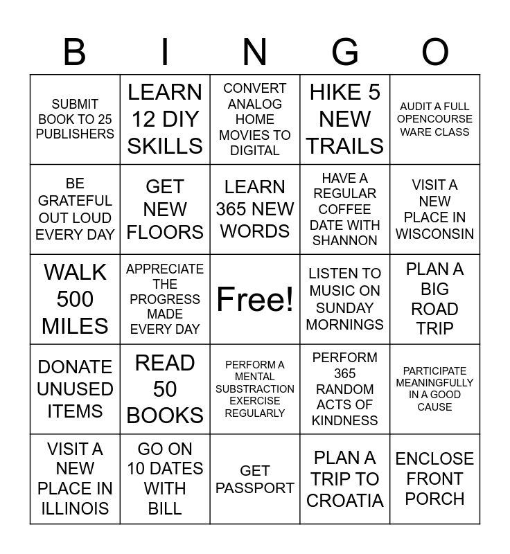 This bingo card has a free space and 24 words: READ 50 BOOKS, GO ON 10 DATES WITH BILL, LEARN 365 NEW WORDS, VISIT A NEW PLACE IN ILLINOIS, AUDIT A FULL OPENCOURSE WARE CLASS, SUBMIT BOOK TO 25 PUBLISHERS, BE GRATEFUL OUT LOUD EVERY DAY, LEARN 12 DIY SKILLS, LISTEN TO MUSIC ON SUNDAY MORNINGS, PERFORM A MENTAL SUBSTRACTION EXERCISE REGULARLY, HAVE A REGULAR COFFEE DATE WITH SHANNON, WALK 500 MILES, PERFORM 365 RANDOM ACTS OF KINDNESS, PARTICIPATE MEANINGFULLY IN A GOOD CAUSE, GET NEW FLOORS, PLAN A TRIP TO CROATIA, PLAN A BIG ROAD TRIP, CONVERT ANALOG HOME MOVIES TO DIGITAL, VISIT A NEW PLACE IN WISCONSIN, APPRECIATE THE PROGRESS MADE EVERY DAY, ENCLOSE FRONT PORCH, DONATE UNUSED ITEMS, HIKE 5 NEW TRAILS and GET PASSPORT.