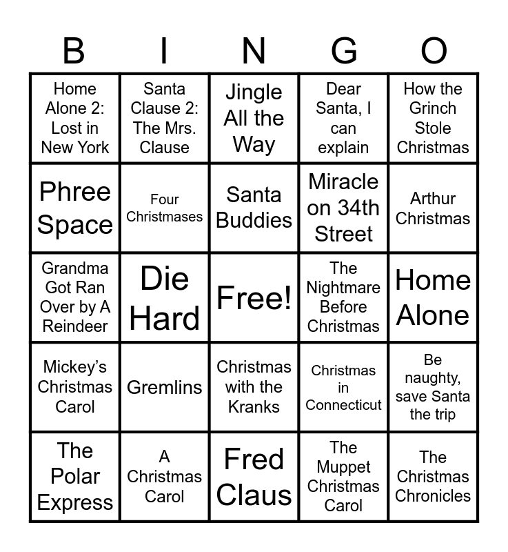 This bingo card has a free space and 65 words: Spirited, Rise of the Guardians (Easter/Christmas), Sleigh all day, then cabernet, Be naughty, save Santa the trip, Bah Humbug!, Scrooge, Santa Clause 2: The Mrs. Clause, The Nutcracker, Santa Buddies, The Little Drummer Boy, Christmas with the Kranks, Twas the Night Before Christmas, Home Alone, How the Grinch Stole Christmas, One Magic Christmas, Phree Space, Die Hard, Home Alone 2: Lost in New York, Rudolph the Red Nosed Reindeer, Miracle on 34th Street, Gremlins, Mickey’s Christmas Carol, Dear Santa, I can explain, Batman Returns, Merry Whatever, Sometimes Naughty, but mostly nice, Deck the Halls, A Boy Called Christmas, The Christmas Chronicles, I’ll Be Home for Christmas, The Polar Express, National Lampoon’s Christmas Vacation, The Night Before, An All Dogs Christmas Carol, Christmas in Connecticut, A Christmas Carol, White Christmas, Grandma Got Ran Over by A Reindeer, The Muppet Christmas Carol, Mr. Magoo’s Christmas Carol, Four Christmases, All I Want for Christmas, The Nightmare Before Christmas, Frosty The Snowman, Babes in Toyland, The Santa Claus, Arthur Christmas, Elf, Jack Frost, The Santa Clause 3: the Escape Claus, The Year Without Santa Clause, Santa Clause is Coming to Town, The Search for Santa Paws, Fred Claus, A Nativity Story, There's snow place like home, A Charlie Brown Christmas, Jingle All the Way, To Grandmother’s House We Go, It’s a Wonderful Life, The Christmas Shoes, Office Christmas Party, A Christmas Story, Holiday Inn and All I got you for Christmas was this BINGO space.