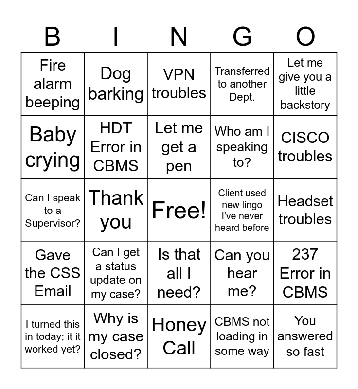 This bingo card has a free space and 24 words: Can I get a status update on my case?, Why is my case closed?, Let me get a pen, I turned this in today; it it worked yet?, Let me give you a little backstory, Fire alarm beeping, Baby crying, Dog barking, Client used new lingo I've never heard before, Is that all I need?, Who am I speaking to?, Can I speak to a Supervisor?, Can you hear me?, 237 Error in CBMS, HDT Error in CBMS, CBMS not loading in some way, Headset troubles, VPN troubles, CISCO troubles, Thank you, You answered so fast, Gave the CSS Email, Transferred to another Dept. and Honey Call.