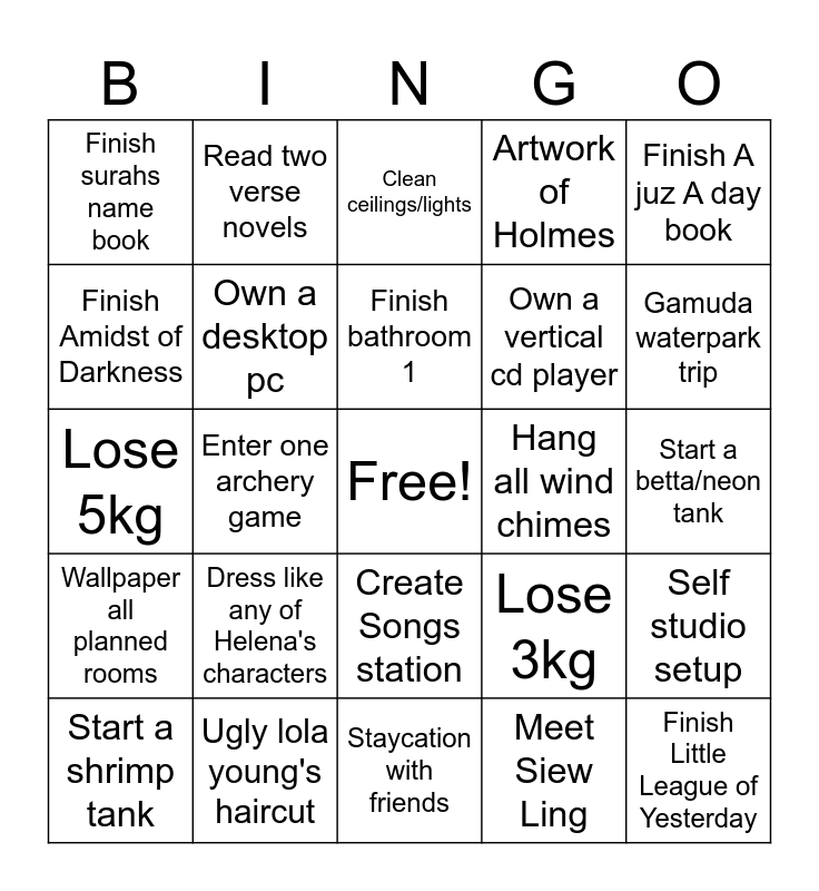 This bingo card has a free space and 24 words: Dress like any of Helena's characters, Ugly lola young's haircut, Finish bathroom 1, Start a shrimp tank, Finish A juz A day book, Finish surahs name book, Finish Amidst of Darkness, Read two verse novels, Hang all wind chimes, Create Songs station, Own a vertical cd player, Lose 5kg, Lose 3kg, Self studio setup, Own a desktop pc, Meet Siew Ling, Start a betta/neon tank, Clean ceilings/lights, Gamuda waterpark trip, Enter one archery game, Finish Little League of Yesterday, Wallpaper all planned rooms, Artwork of Holmes and Staycation with friends.