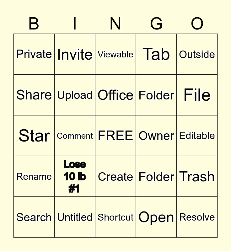 This bingo card has a free space and 24 words: Lose 10 lb #1, Untitled, Office, Search, Outside, Private, Share, Invite, Owner, Create, Folder, Star, Folder, Trash, Upload, Open, Editable, Viewable, File, Comment, Resolve, Rename, Tab and Shortcut.