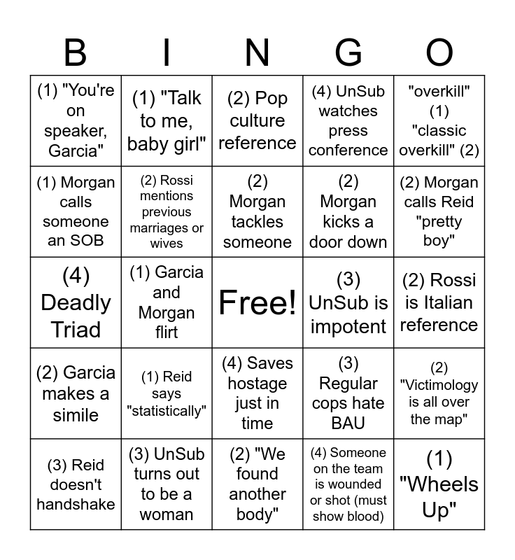 This bingo card has a free space and 24 words: (1) Reid says "statistically", (3) UnSub turns out to be a woman, (2) Morgan tackles someone, (3) Reid doesn't handshake, "overkill" (1) "classic overkill" (2), (1) "You're on speaker, Garcia", (1) Morgan calls someone an SOB, (1) "Talk to me, baby girl", (3) UnSub is impotent, (4) Saves hostage just in time, (2) Morgan kicks a door down, (4) Deadly Triad, (3) Regular cops hate BAU, (2) "Victimology is all over the map", (2) Rossi mentions previous marriages or wives, (4) Someone on the team is wounded or shot (must show blood), (2) Rossi is Italian reference, (2) Pop culture reference, (2) Morgan calls Reid "pretty boy", (1) Garcia and Morgan flirt, (1) "Wheels Up", (2) Garcia makes a simile, (4) UnSub watches press conference and (2) "We found another body".