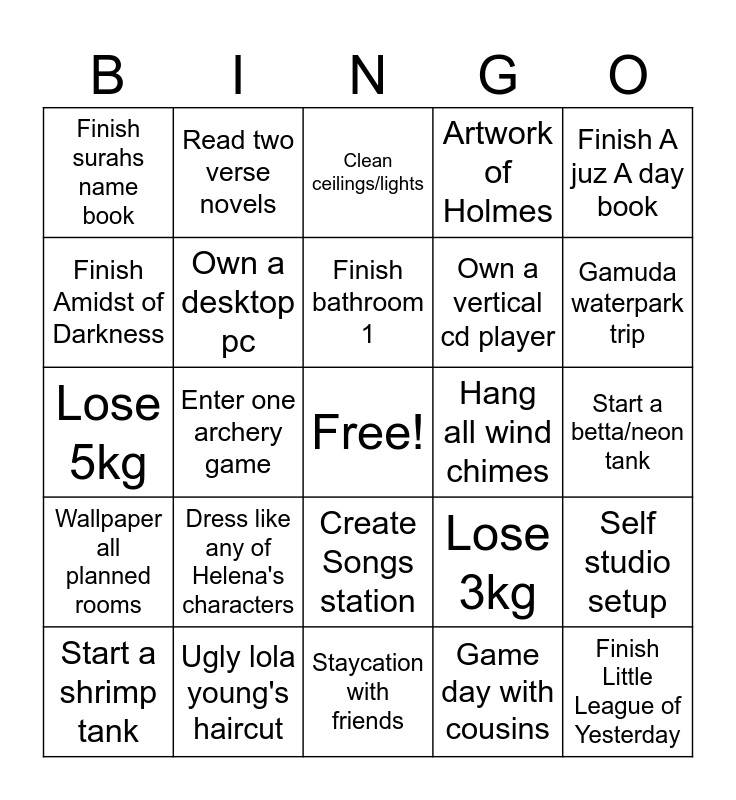 This bingo card has a free space and 24 words: Dress like any of Helena's characters, Ugly lola young's haircut, Finish bathroom 1, Start a shrimp tank, Finish A juz A day book, Finish surahs name book, Finish Amidst of Darkness, Read two verse novels, Hang all wind chimes, Create Songs station, Own a vertical cd player, Lose 5kg, Lose 3kg, Self studio setup, Own a desktop pc, Game day with cousins, Start a betta/neon tank, Clean ceilings/lights, Gamuda waterpark trip, Enter one archery game, Finish Little League of Yesterday, Wallpaper all planned rooms, Artwork of Holmes and Staycation with friends.