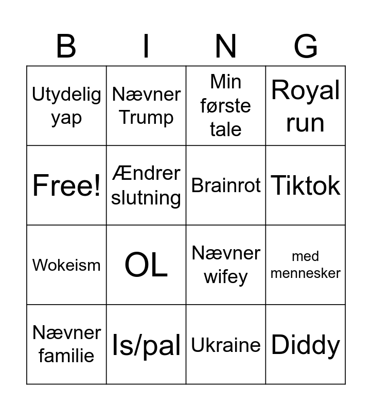 This bingo card has 16 words: Is/pal, med mennesker, Min første tale, Utydelig yap, Wokeism, Nævner Trump, Nævner wifey, Ukraine, Free!, Ændrer slutning, Nævner familie, Royal run, OL, Tiktok, Brainrot and Diddy.