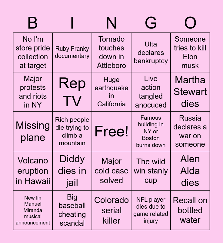This bingo card has a free space and 24 words: Diddy dies in jail, Big baseball cheating scandal, Huge earthquake in California, New lin Manuel Miranda musical announcement, Someone tries to kill Elon musk, No I'm store pride collection at target, Major protests and riots in NY, Ruby Franky documentary, Famous building in NY or Boston burns down, Major cold case solved, Live action tangled anocuced, Missing plane, The wild win stanly cup, Alen Alda dies, Rep TV, NFL player dies due to game related injury, Russia declares a war on someone, Tornado touches down in Attleboro, Martha Stewart dies, Rich people die trying to climb a mountain, Recall on bottled water, Volcano eruption in Hawaii, Ulta declares bankruptcy and Colorado serial killer.