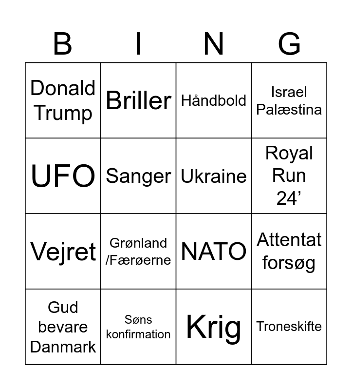 This bingo card has 23 words: Troneskifte, Mary, Royal Run 24’, Mor (Margrethe), UFO, Donald Trump, Sanger, Briller, Gud bevare Danmark, Dårlig, Grønland /Færøerne, Vejret, Gud bevare Danmark, Nævner mere end 3 måneder, Søns konfirmation, EM, Håndbold, NATO, Ukraine, Attentat forsøg, Israel Palæstina, Krig and Takker folket.
