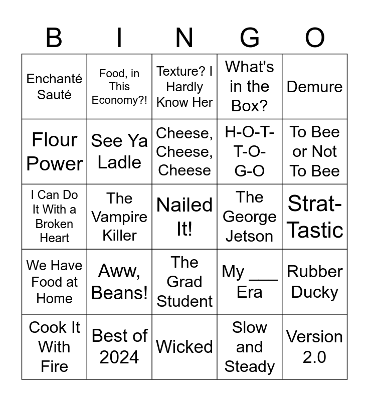 This bingo card has a free space and 24 words: Aww, Beans!, Best of 2024, Cheese, Cheese, Cheese, Cook It With Fire, Demure, Enchanté Sauté, Flour Power, Food, in This Economy?!, The George Jetson, The Grad Student, H-O-T-T-O- G-O, I Can Do It With a Broken Heart, My ___ Era, Rubber Ducky, See Ya Ladle, Slow and Steady, Strat-Tastic, Texture? I Hardly Know Her, To Bee or Not To Bee, The Vampire Killer, Version 2.0, We Have Food at Home, What's in the Box? and Wicked.