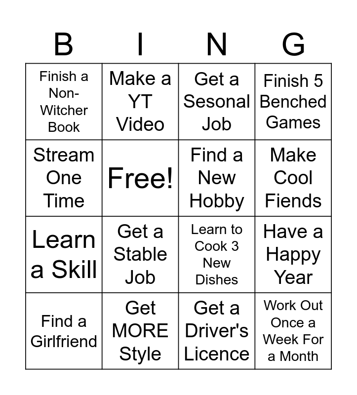 This bingo card has 16 words: Find a Girlfriend, Get MORE Style, Get a Sesonal Job, Finish 5 Benched Games, Stream One Time, Make a YT Video, Learn to Cook 3 New Dishes, Have a Happy Year, Finish a Non-Witcher Book, Free!, Get a Driver's Licence, Make Cool Fiends, Learn a Skill, Get a Stable Job, Find a New Hobby and Work Out Once a Week For a Month.