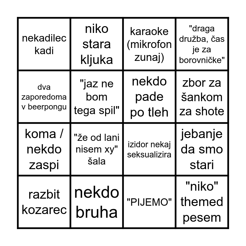 This bingo card has 16 words: nekdo bruha, jebanje da smo stari, karaoke (mikrofon zunaj), nekadilec kadi, koma / nekdo zaspi, niko stara kljuka, izidor nekaj seksualizira, "PIJEMO", dva zaporedoma v beerpongu, "jaz ne bom tega spil", razbit kozarec, "draga družba, čas je za borovničke", "že od lani nisem xy" šala, zbor za šankom za shote, nekdo pade po tleh and "niko" themed pesem.