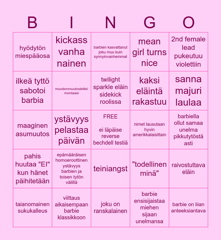This bingo card has a free space and 24 words: epämääräisen homoeroottinen ystävyys barbien ja toisen tytön välillä, viittaus aikaisempaan barbie klassikkoon, twilight sparkle eläin sidekick roolissa, taianomainen sukukalleus, 2nd female lead pukeutuu violettiin, hyödytön miespääosa, ilkeä tyttö sabotoi barbia, kickass vanha nainen, nimet lausutaan hyvin amerikkalaisittain, teiniangst, kaksi eläintä rakastuu, maaginen asumuutos, "todellinen minä", raivostuttava eläin, muodonmuutosleikki montaasi, barbie ensisijaistaa miehen sijaan unelmansa, barbiella ollut samaa unelma pikkutytöstä asti, barbien kasvattanut joku muu kuin synnyinvanhemmat, sanna majuri laulaa, ystävyys pelastaa päivän, barbie on liian anteeksiantava, pahis huutaa "EI" kun hänet päihitetään, mean girl turns nice and joku on ranskalainen.