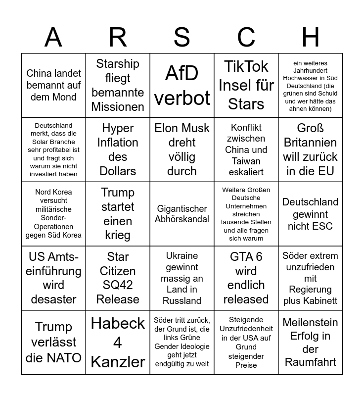This bingo card has a free space and 24 words: Star Citizen SQ42 Release, Habeck 4 Kanzler, Elon Musk dreht völlig durch, Trump verlässt die NATO, ein weiteres Jahrhundert Hochwasser in Süd Deutschland (die grünen sind Schuld und wer hätte das ahnen können), China landet bemannt auf dem Mond, Deutschland merkt, dass die Solar Branche sehr profitabel ist und fragt sich warum sie nicht investiert haben, Starship fliegt bemannte Missionen, Weitere Großen Deutsche Unternehmen streichen tausende Stellen und alle fragen sich warum, Ukraine gewinnt massig an Land in Russland, Konflikt zwischen China und Taiwan eskaliert, Nord Korea versucht militärische Sonder-Operationen gegen Süd Korea, GTA 6 wird endlich released, Söder extrem unzufrieden mit Regierung plus Kabinett, Hyper Inflation des Dollars, Steigende Unzufriedenheit in der USA auf Grund steigender Preise, Deutschland gewinnt nicht ESC, AfD verbot, Groß Britannien will zurück in die EU, Trump startet einen krieg, Meilenstein Erfolg in der Raumfahrt, US Amts- einführung wird desaster, TikTok Insel für Stars and Söder tritt zurück, der Grund ist, die links Grüne Gender Ideologie geht jetzt endgültig zu weit.