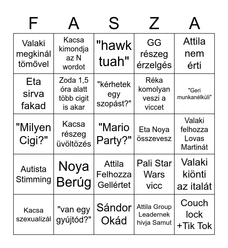 This bingo card has a free space and 24 words: Noya Berúg, "van egy gyújtód?", "kérhetek egy szopást?", Kacsa szexualizál, Attila nem érti, Valaki megkinál tömővel, Eta sirva fakad, Kacsa kimondja az N wordot, Eta Noya összevesz, Attila Felhozza Gellértet, Réka komolyan veszi a viccet, "Milyen Cigi?", Pali Star Wars vicc, Valaki kiönti az italát, Zoda 1,5 óra alatt több cigit is akar, Attila Group Leadernek hivja Samut, Valaki felhozza Lovas Martinát, "hawk tuah", "Geri munkanélküli", Kacsa részeg üvöltözés, Couch lock +Tik Tok, Autista Stimming, GG részeg érzelgés and Sándor Okád.