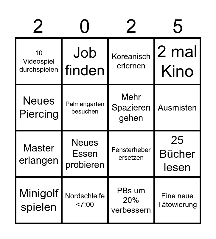 This bingo card has 16 words: Nordschleife <7:00, 25 Bücher lesen, Koreanisch erlernen, 10 Videospiel durchspielen, Master erlangen, Job finden, Fensterheber ersetzen, PBs um 20% verbessern, Neues Piercing, Palmengarten besuchen, Minigolf spielen, 2 mal Kino, Neues Essen probieren, Ausmisten, Mehr Spazieren gehen and Eine neue Tätowierung.