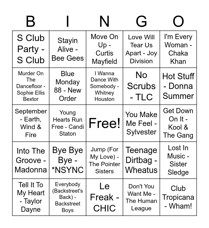 This bingo card has a free space and 28 words: Lost In Music - Sister Sledge, Fantasy - Mariah Carey, No Scrubs - TLC, Don't You Want Me - The Human League, Murder On The Dancefloor - Sophie Ellis Bextor, Move On Up - Curtis Mayfield, Stayin Alive - Bee Gees, Into The Groove - Madonna, You Make Me Feel - Sylvester, Tell It To My Heart - Taylor Dayne, September - Earth, Wind & Fire, Love Will Tear Us Apart - Joy Division, Everybody (Backstreet's Back) - Backstreet Boys, Le Freak - CHIC, Hot Stuff - Donna Summer, Groove Is In The Heart - Deee-Lite, Bye Bye Bye - *NSYNC, Blue Monday 88 - New Order, I Wanna Dance With Somebody - Whitney Houston, Jump (For My Love) - The Pointer Sisters, S Club Party - S Club, Lady Marmalade - LaBelle, Club Tropicana - Wham!, Young Hearts Run Free - Candi Staton, Get Down On It - Kool & The Gang, Teenage Dirtbag - Wheatus, I'm Every Woman - Chaka Khan and It's Raining Men - The Weather Girls.