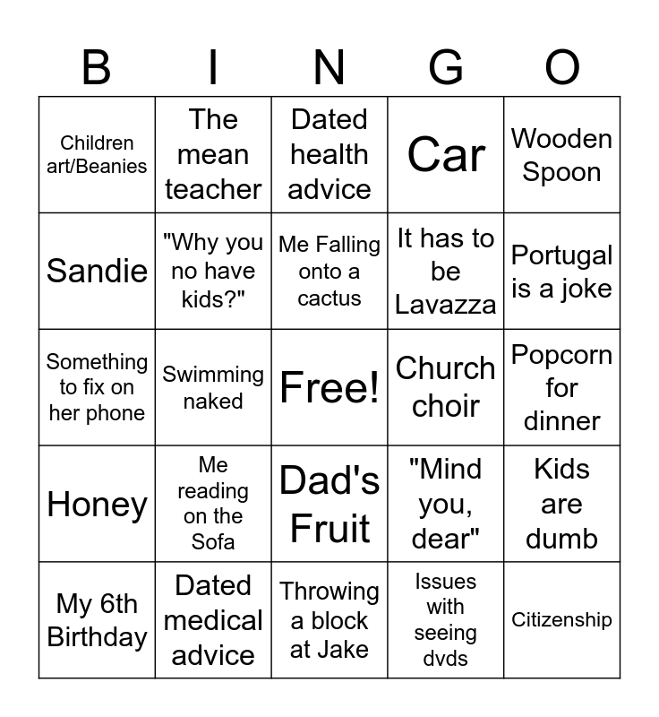 This bingo card has a free space and 25 words: Me reading on the Sofa, Throwing a block at Jake, Me Falling onto a cactus, My 6th Birthday, Wooden Spoon, Children art/Beanies, Sandie, The mean teacher, Church choir, Dad's Fruit, It has to be Lavazza, Something to fix on her phone, "Mind you, dear", Kids are dumb, "Why you no have kids?", Dad's music, Popcorn for dinner, Dated health advice, Portugal is a joke, Swimming naked, Citizenship, Dated medical advice, Honey, Car and Issues with seeing dvds.
