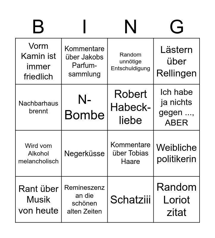 This bingo card has 16 words: Remineszenz an die schönen alten Zeiten, Weibliche politikerin, Random unnötige Entschuldigung, Vorm Kamin ist immer friedlich, Wird vom Alkohol melancholisch, Kommentare über Jakobs Parfum-sammlung, Kommentare über Tobias Haare, Schatziii, Nachbarhaus brennt, N-Bombe, Rant über Musik von heute, Lästern über Rellingen, Negerküsse, Ich habe ja nichts gegen ..., ABER, Robert Habeck-liebe and Random Loriot zitat.