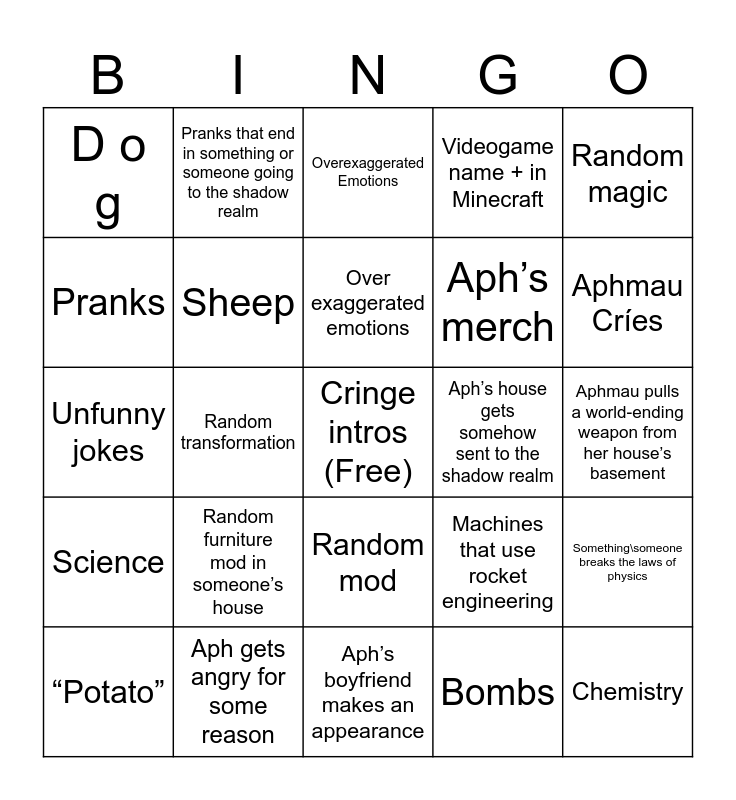 This bingo card has a free space and 24 words: Random furniture mod in someone’s house, Aph gets angry for some reason, Over exaggerated emotions, “Potato”, Random magic, D o g, Pranks, Pranks that end in something or someone going to the shadow realm, Aph’s house gets somehow sent to the shadow realm, Random mod, Aph’s merch, Unfunny jokes, Machines that use rocket engineering, Something\someone breaks the laws of physics, Sheep, Bombs, Aphmau pulls a world-ending weapon from her house’s basement, Overexaggerated Emotions, Aphmau Críes, Random transformation, Chemistry, Science, Videogame name + in Minecraft and Aph’s boyfriend makes an appearance.