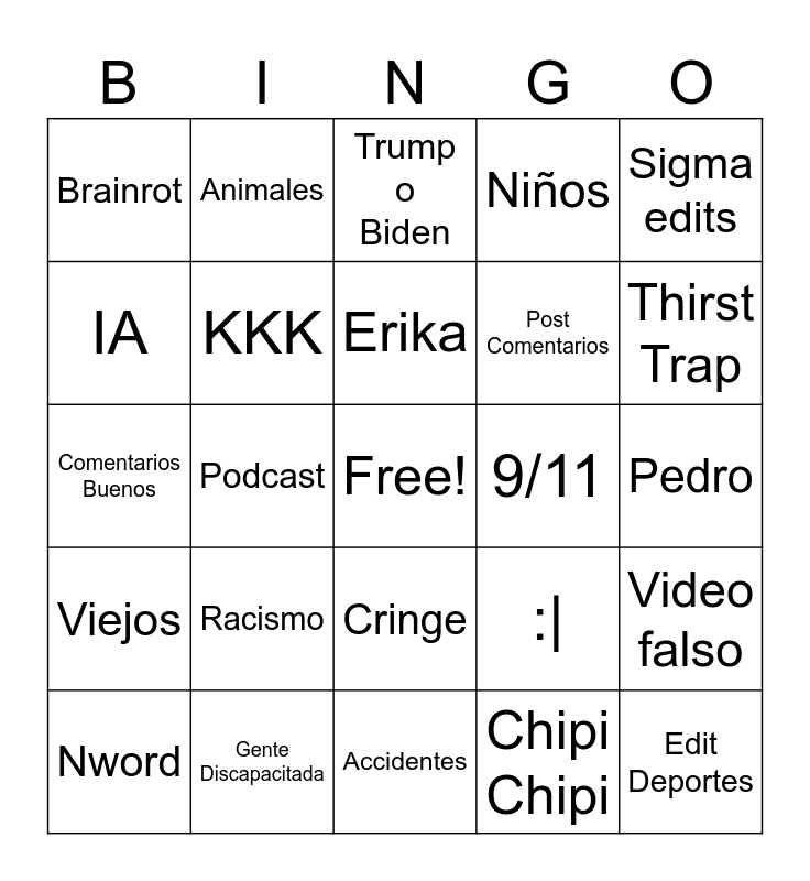 This bingo card has a free space and 24 words: Racismo, Gente Discapacitada, Erika, Nword, Sigma edits, Brainrot, IA, Animales, 9/11, Cringe, Post Comentarios, Comentarios Buenos, :|, Video falso, KKK, Chipi Chipi, Pedro, Trump o Biden, Thirst Trap, Podcast, Edit Deportes, Viejos, Niños and Accidentes.