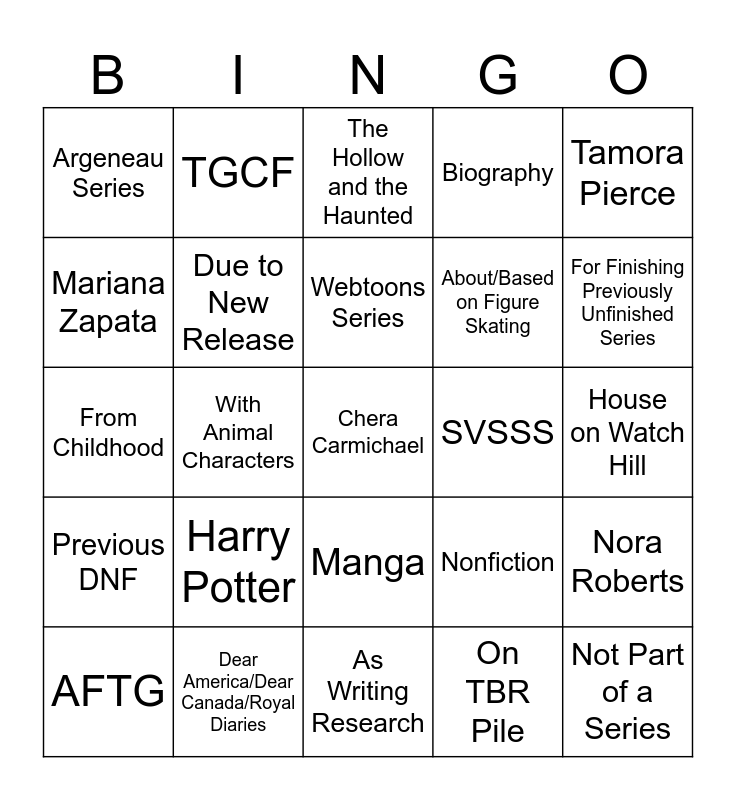 This bingo card has a free space and 24 words: Harry Potter, Dear America/Dear Canada/Royal Diaries, Webtoons Series, AFTG, Tamora Pierce, Argeneau Series, Mariana Zapata, TGCF, SVSSS, Manga, About/Based on Figure Skating, From Childhood, Nonfiction, Nora Roberts, Due to New Release, On TBR Pile, House on Watch Hill, The Hollow and the Haunted, For Finishing Previously Unfinished Series, With Animal Characters, Not Part of a Series, Previous DNF, Biography and As Writing Research.