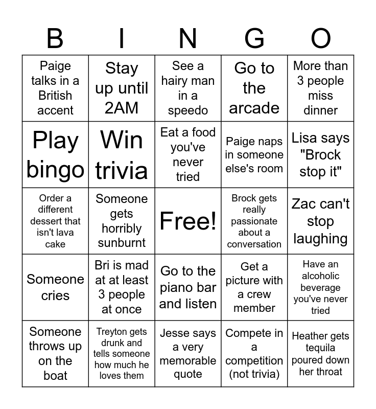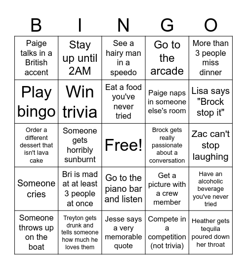 This bingo card has a free space and 29 words: Someone throws up on the boat, Jesse haggles someone down at least 25%, Someone gets horribly sunburnt, Lisa thinks it's her brithday, Paige talks in a British accent, See a hairy man in a speedo, Win trivia, Bri is mad at at least 3 people at once, Brock gets really passionate about a conversation, Treyton gets drunk and tells someone how much he loves them, Zac can't stop laughing, Heather gets tequila poured down her throat, Jesse says a very memorable quote, Compete in a competition (not trivia), Lisa says "Brock stop it", Eat pizza at least twice, Go to the piano bar and listen, Someone cries, More than 3 people miss dinner, Order a different dessert that isn't lava cake, Get a picture with a crew member, Go to at least two shows, Paige naps in someone else's room, Play bingo, Go to the arcade, Stay up until 2AM, Have an alcoholic beverage you've never tried, Eat a food you've never tried and Find a duck!.