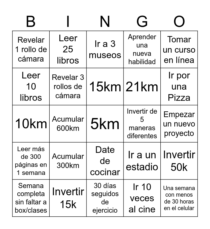 This bingo card has 25 words: Acumular 300km, 30 días seguidos de ejercicio, 15km, Semana completa sin faltar a box/clases, Tomar un curso en línea, Revelar 1 rollo de cámara, Leer 10 libros, Leer 25 libros, Invertir de 5 maneras diferentes, Date de cocinar, 21km, 10km, Ir a un estadio, Invertir 50k, Revelar 3 rollos de cámara, Una semana con menos de 30 horas en el celular, Empezar un nuevo proyecto, Ir a 3 museos, Ir por una Pizza, Acumular 600km, 5km, Invertir 15k, Leer más de 300 páginas en 1 semana, Aprender una nueva habilidad and Ir 10 veces al cine.