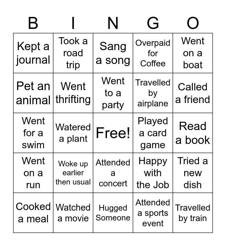 This bingo card has a free space and 24 words: Woke up earlier then usual, Watched a movie, Went to a party, Cooked a meal, Went on a boat, Kept a journal, Pet an animal, Took a road trip, Played a card game, Attended a concert, Travelled by airplane, Went for a swim, Happy with the Job, Tried a new dish, Went thrifting, Attended a sports event, Read a book, Sang a song, Called a friend, Watered a plant, Travelled by train, Went on a run, Overpaid for Coffee and Hugged Someone.