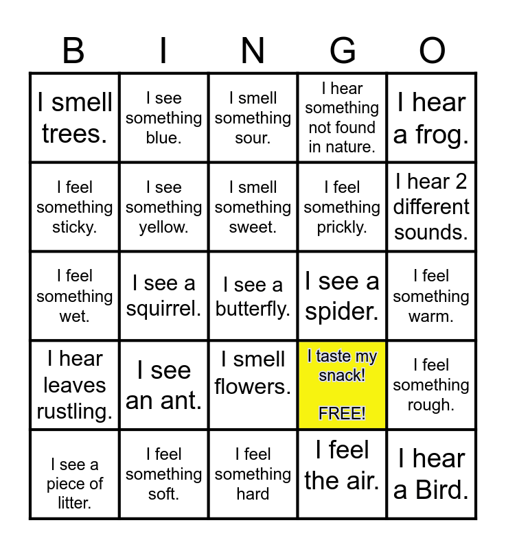 This bingo card has 25 words: I see an ant., I feel something hard, I smell something sweet., I see a piece of litter., I hear a frog., I smell trees., I feel something sticky., I see something blue., I see a spider., I smell flowers., I feel something prickly., I feel something wet., I taste my snack! FREE!, I feel something rough., I see something yellow., I hear a Bird., I feel something warm., I smell something sour., I hear 2 different sounds., I see a squirrel., I see a butterfly., I feel something soft., I hear leaves rustling., I hear something not found in nature. and I feel the air..