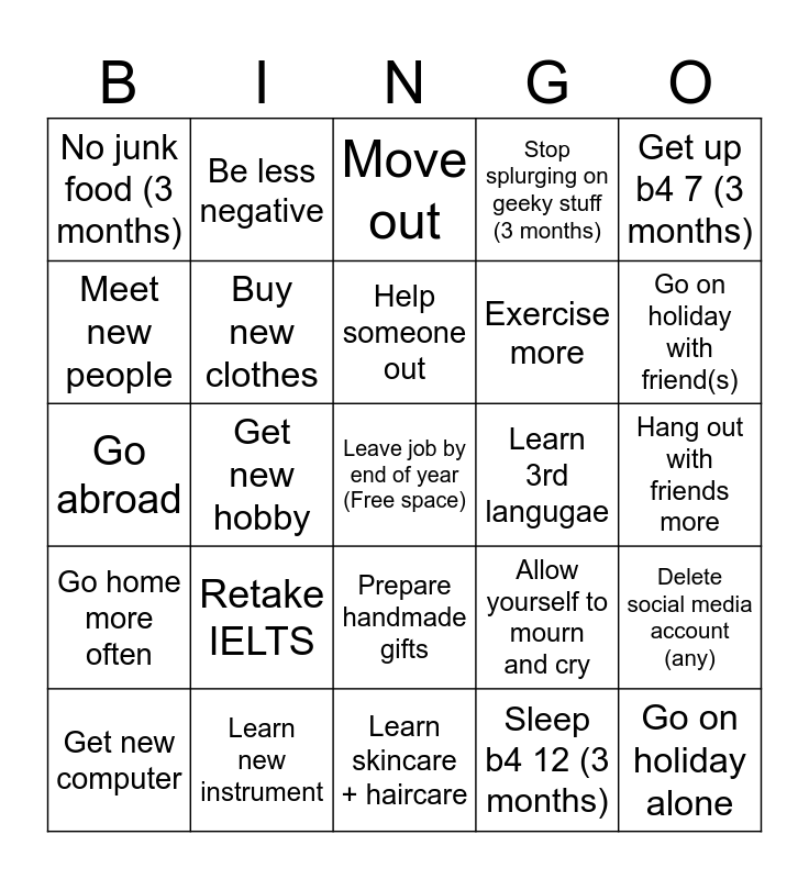 This bingo card has a free space and 24 words: Retake IELTS, Learn new instrument, Help someone out, Get new computer, Get up b4 7 (3 months), No junk food (3 months), Meet new people, Be less negative, Learn 3rd langugae, Prepare handmade gifts, Exercise more, Go abroad, Allow yourself to mourn and cry, Delete social media account (any), Buy new clothes, Sleep b4 12 (3 months), Hang out with friends more, Move out, Go on holiday with friend(s), Get new hobby, Go on holiday alone, Go home more often, Stop splurging on geeky stuff (3 months) and Learn skincare + haircare.