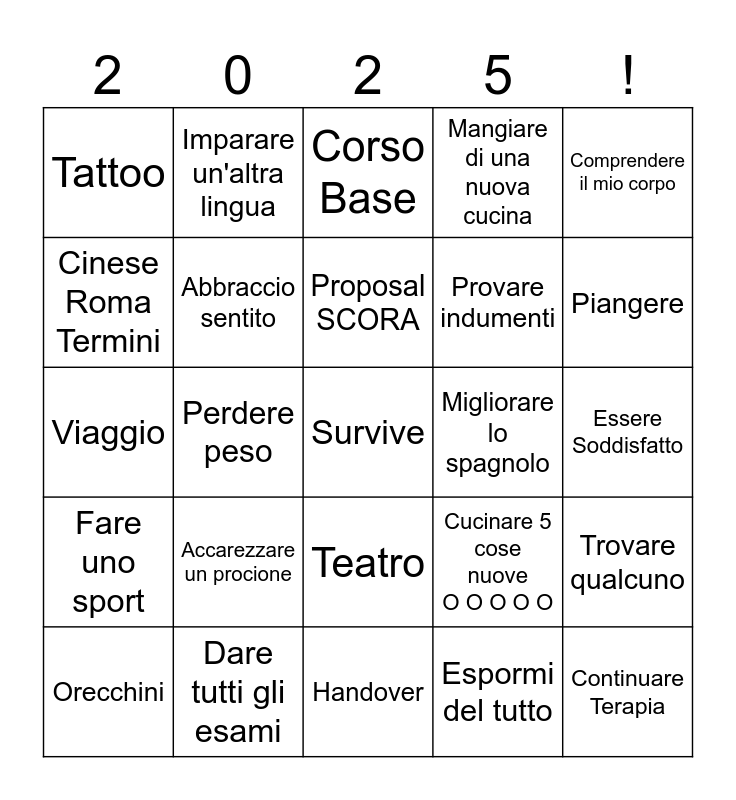 This bingo card has a free space and 24 words: Orecchini, Accarezzare un procione, Proposal SCORA, Espormi del tutto, Comprendere il mio corpo, Tattoo, Imparare un'altra lingua, Corso Base, Migliorare lo spagnolo, Essere Soddisfatto, Viaggio, Abbraccio sentito, Cucinare 5 cose nuove O O O O O, Trovare qualcuno, Cinese Roma Termini, Dare tutti gli esami, Handover, Mangiare di una nuova cucina, Piangere, Fare uno sport, Perdere peso, Teatro, Provare indumenti and Continuare Terapia.