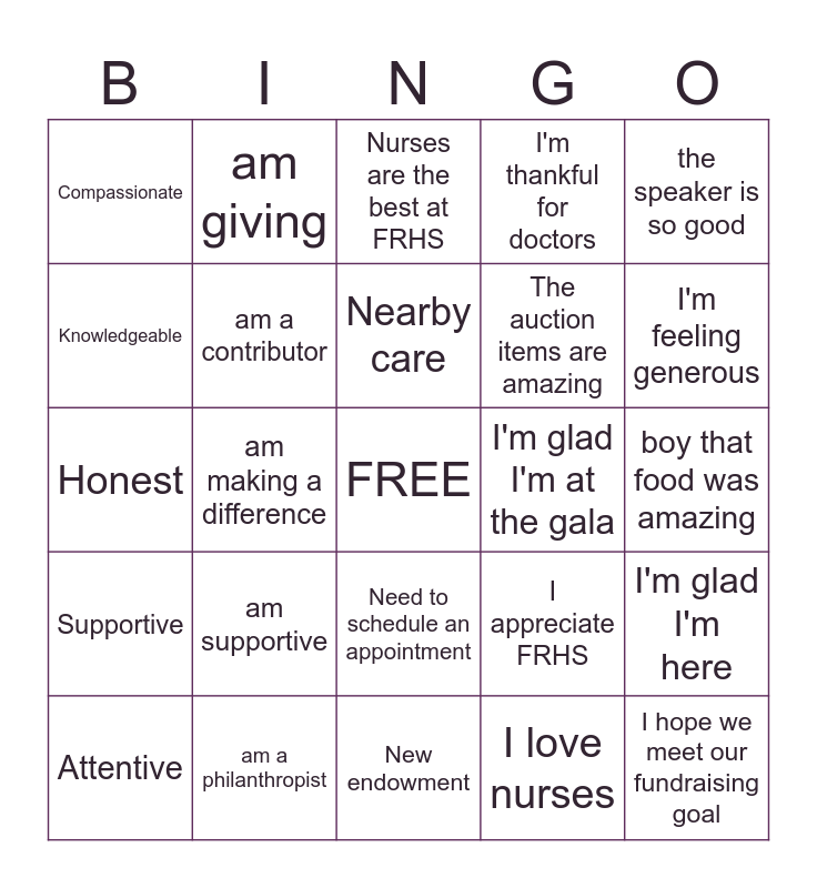 This bingo card has a free space and 42 words: Caring, am a contributor, No place I'd rather be, I love nurses, I hope we meet our fundraising goal, Attentive, am supportive, Never take your health for granted, I'm thankful for doctors, boy that food was amazing, Supportive, am making a difference, I appreciate FRHS, I'm feeling generous, Kind, am a philanthropist, Need to schedule an appointment, I'm glad I'm at the gala, these decorations are lovely, Compassionate, am giving, New endowment, I love our community, the speaker is so good, Excellent, am caring, Nurses are the best at FRHS, This is a great event, I appreciate rural healthcare, Warm, am generous, Nearby care, The auction items are amazing, I'm glad I'm here, Dependable, am invested, This wine is delicious, Honest, need another drink, I hope I get a BINGO, Knowledgeable and love the music tonight.